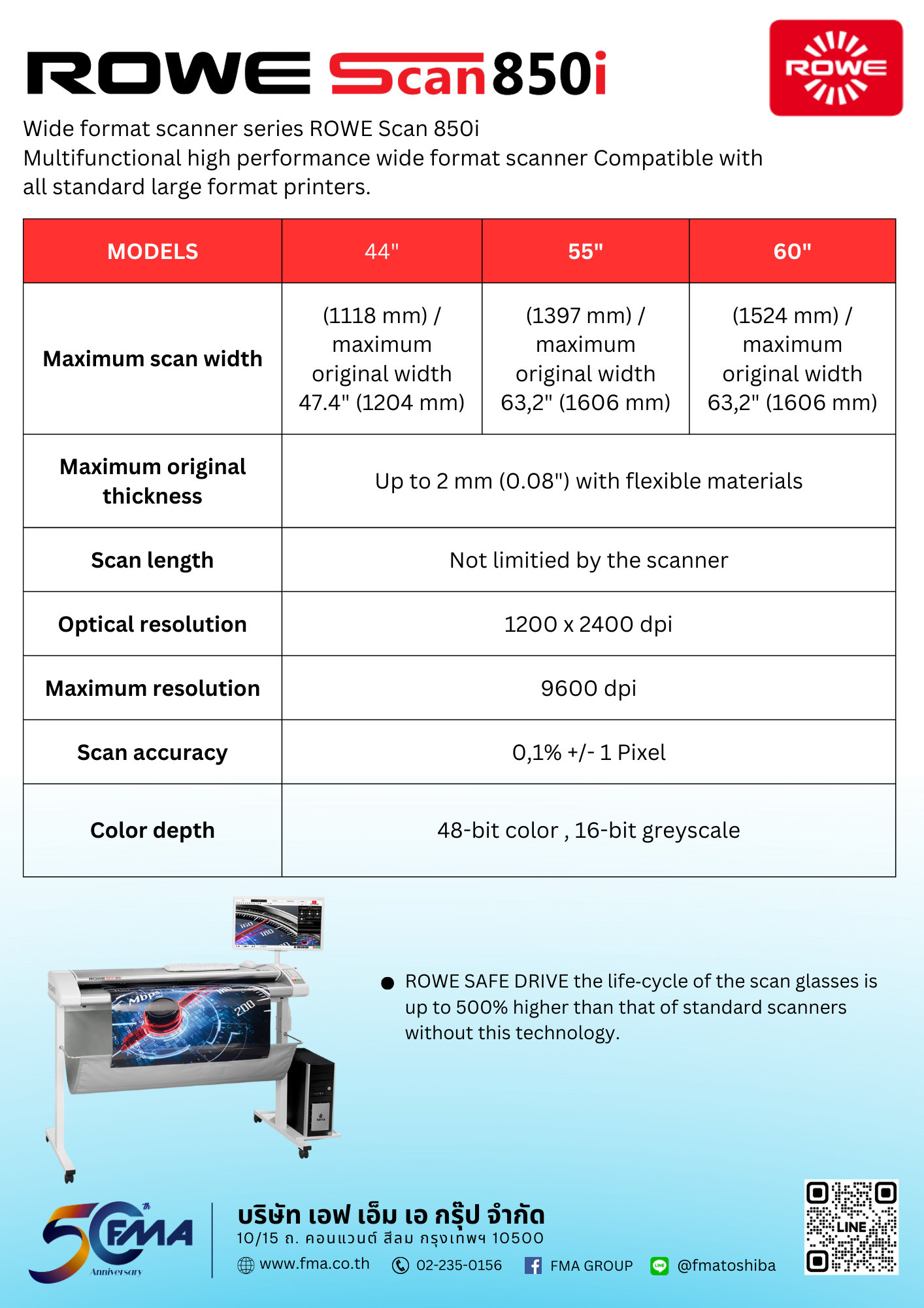 Wide format scanner series ROWE Scan 850i The Future of Scanning. ผู้นำตัวจริงด้านนวัตกรรม ROWE ได้รับรางวัลสูงสุดด้านนวัตกรรมผลิตภัณฑ์จากคณะกรรมการผู้เชี่ยวชาญ เครื่องสแกนแบบหน้ากว้าง ROWE Scan 850i ขนาด 44 นิ้ว 55 นิ้ว และ 60 นิ้ว ที่มาพร้อมเทคโนโลยีล้ำสมัย สามารถปรับระดับความสูงงานแสกนได้สูงสุดถึง 30 ม.ม. เแสดงให้เห็นถึงนวัตกรรม ประสิทธิภาพการทำงาน และสิทธิบัตรด้านเทคโนโลยีมากมาย ขอเชิญคุณมาสัมผัสกับความน่าหลงใหลของ ROWE Scan 850i